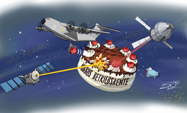Wie bei ZF werden auch Airbus die Rentner zu teuer Der Luftfahrtkonzern Airbus garantiert keine feste Verzinsung der Betriebsrenten mehr. Denn die Nullzinsen machen das bisherige System unfinanzierbar. Karikatur-Cartoon, erschienen im Südkurier Konstanz. Lokalteil Friedrichshafen, Mehr dazu hier bei Südkurier online.