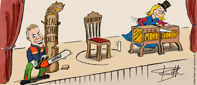 Erschienen im Südkurier Konstanz, Lokalteil Überlingen am Samstag, 15. März 2014In Überlingen sägt die CDU am Stuhl von OB Sabine Becker, OB Härle aus Salem will die Realschule klammheimlich absägen und die Verwaltung Überlingen zersägt das Wegerecht eines Bürgers beim geplanten Verkauf des alten Rathaus in Nussdorf. Suchworte: Politik, absägen, CDU, Bürgermeister, Oberbürgermeister, Probleme