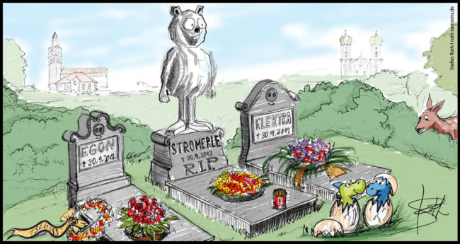 Karikatur erschienen im Südkurier Konstanz, lokalteil Überlingen am Samstag, 6. Oktober 2012 Überlingen nimmt Abschied von Stromerle: Das SWÜ-Maskottchen wurde, gemeinsam mit Egon und Elektra (TWF), zu Grabe getragen. Sie machen Mona und Faro, waschbaren Dinosauriern und neue Sympathieträger des Stadtwerks am See, den nötigen Platz. Mehr darüber auf Südkurier online hier. Suchworte: Überlingen,…