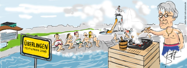 Karikatur- erschienen am 20.10.2012 im Südkurier Konstanz, Lokalteil Überlingen Es gibt grünes Licht für die Erweiterung der Therme durch Saunaanbau. Mehr hier. Suchworte: Hitze, Sauna, Überlingen, Schwimmbad, Hitzewelle