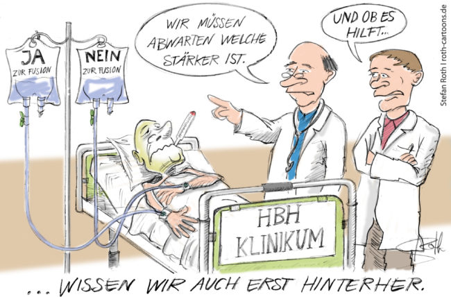 Erschienen am Mittwoch, 18. Juli im Südkurier Konstanz, Lokalteil Singen. Werden die Bürger beim Bürgerentscheid für oder gegen die Fusion des HBH Klinikums mit dem Konstanzer Klinikum stimmen? Suchworte: HBH-Klinikum, Singen, Konstanz, Artzt, Krankenhaus, Klinikum, Klinik, Patient, Doktor